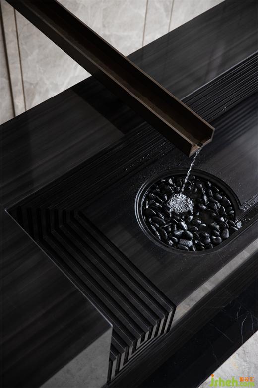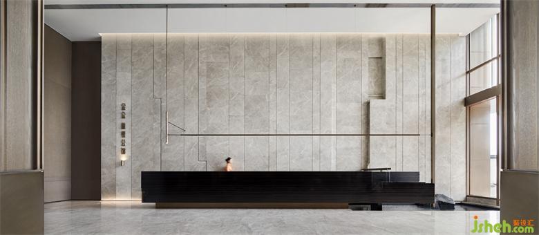 步行穿越室外嶺南園林意境的山重水復(fù),接待區(qū)筆直的幾何線條與淡雅的灰色木紋石材交織出一派寧靜深遠(yuǎn)。借助豎向且有韻律的線條將立面灰色木紋石材縱向鋪排,包裹黑色木紋石材的長(zhǎng)條接待臺(tái)延伸著空間尺度。