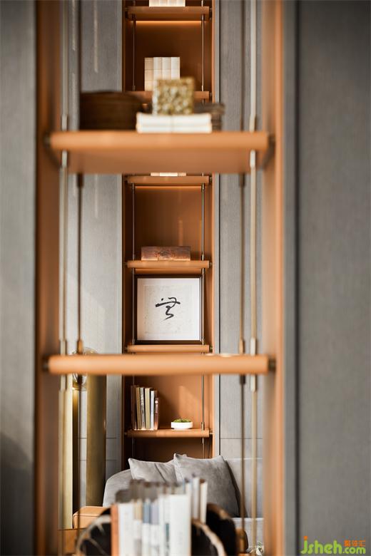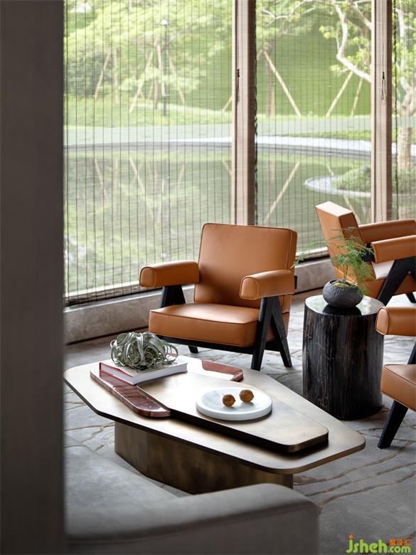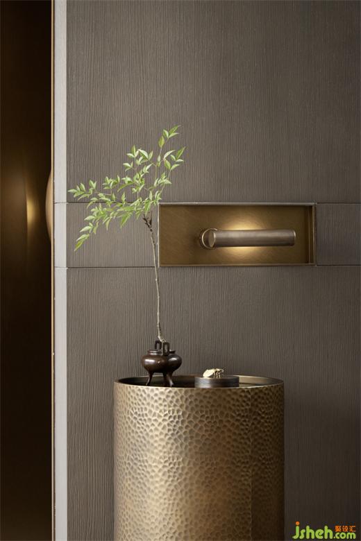 落落高大的溫潤淺灰色木紋,點綴古銅金屬藝術(shù)燈具,水墨靠枕喚醒了赭石色與灰色皮革沙發(fā)的溫雅。同色系手工錘紋金屬圓形邊幾,襯一棵單株南天竺,安靜而純粹,靜靜感知當(dāng)下的勃勃生機(jī)。