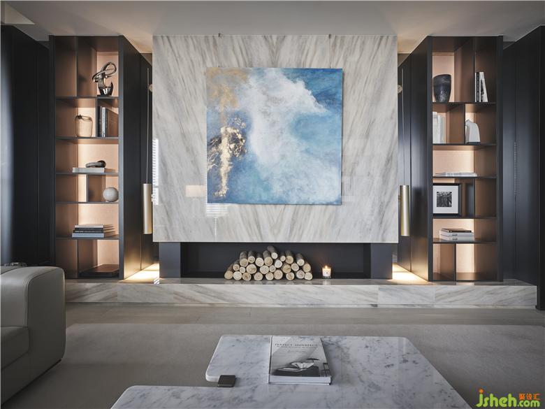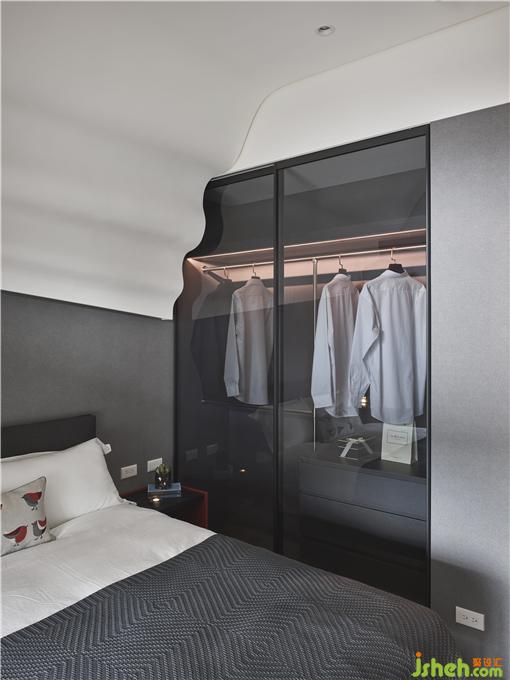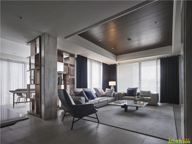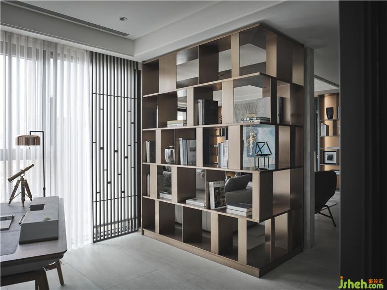 本案隱藏於玄關後方的隱藏衣帽間,利用衣帽櫃凹洞達到展示機能,成為入門端景。推開左側格柵門片,一處進門後可稍作沉澱的多功能書房,窗面兩端同樣以不規(guī)則寬窄線條交錯的格柵屏風營造寧靜感,當日光灑落即形成有趣的光影律動。具透視感的鍍鈦櫃體既是書櫃,也是界分區(qū)域的造型屏風,更拉伸了沙發(fā)背牆的尺度,成就完整大器的客廳。緊鄰客廳的開放式餐廚,運用結構柱的深度延伸出酒窖,餐敘場域在穿透開闊的空間,細細品味生活。裝修公司