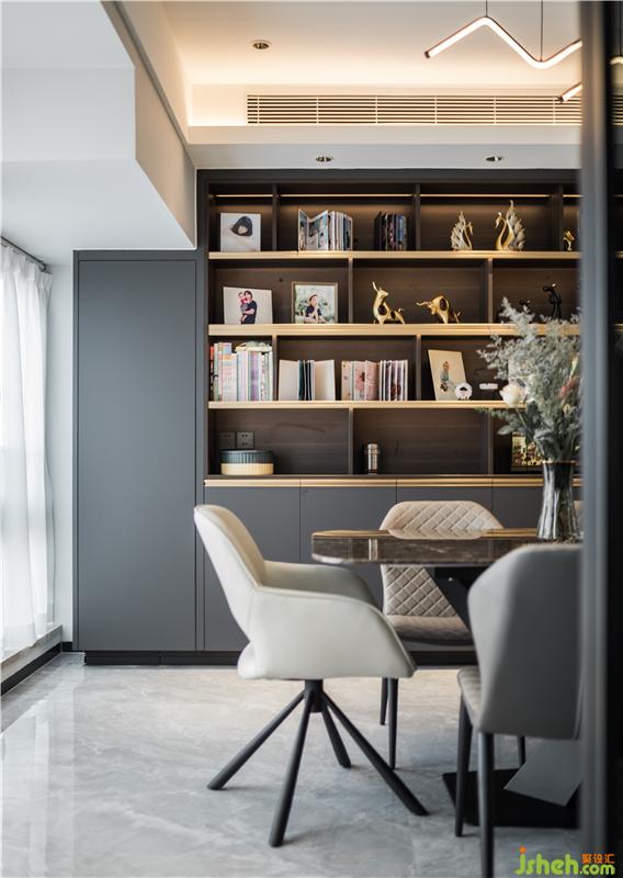 餐廳整體延續(xù)客廳風(fēng)格,加入整面的書柜,擺脫餐邊柜的刻板印象,滿足一家人有大量讀物擺放和展示需求,同時(shí)營(yíng)造一個(gè)親子氛圍空間,拉近父母與小朋友的互動(dòng)。