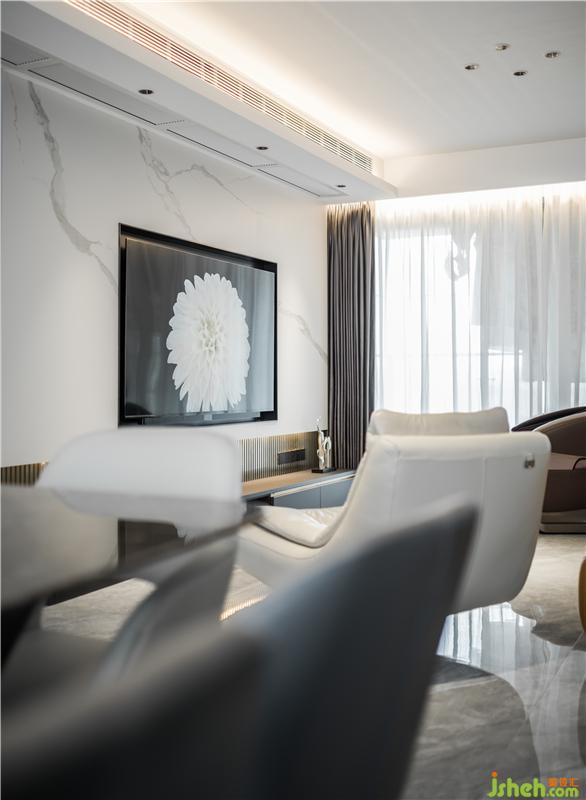 客廳電視墻不銹鋼結(jié)合白色巖板,屬性相異的材質(zhì)放在一起,碰撞出低奢又高雅的火花。蒸汽壁爐的加入則靈動(dòng)了整個(gè)空間,畫龍點(diǎn)睛之作,又似生命散發(fā)的活力。