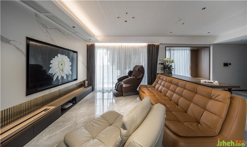 對(duì)于氛圍打造也起到重要作用,天花隱藏?zé)魩I(yíng)造出整個(gè)空間氣氛的細(xì)膩?zhàn)兓?。隱藏的點(diǎn)光源則作為空間主光源處理。整個(gè)空間不同體塊層疊的層次感,在材質(zhì)的選擇上以中性灰色打底,暖白調(diào)貫穿,棕色點(diǎn)綴,形成冷暖色調(diào)對(duì)立,讓一個(gè)空間中造型的繁簡(jiǎn)與材質(zhì)深淺進(jìn)行節(jié)奏對(duì)話,不讓定義風(fēng)格干擾空間的想象力。