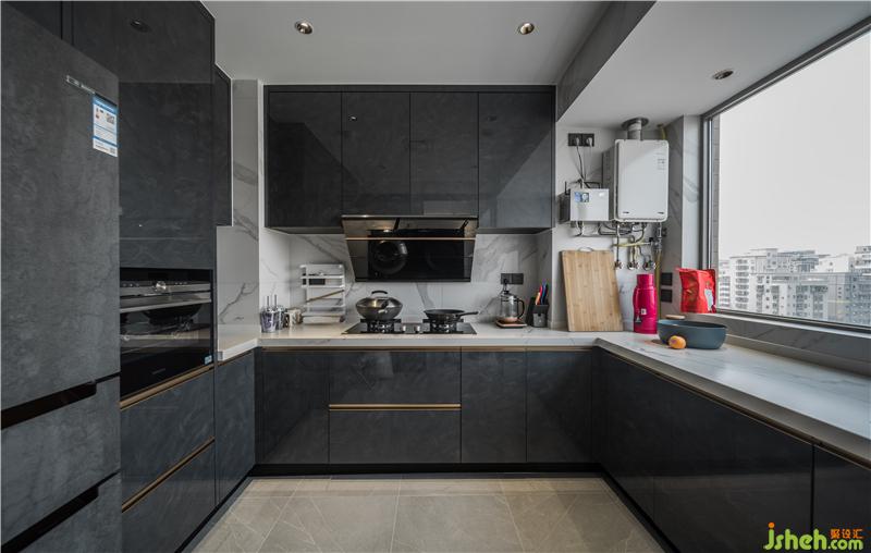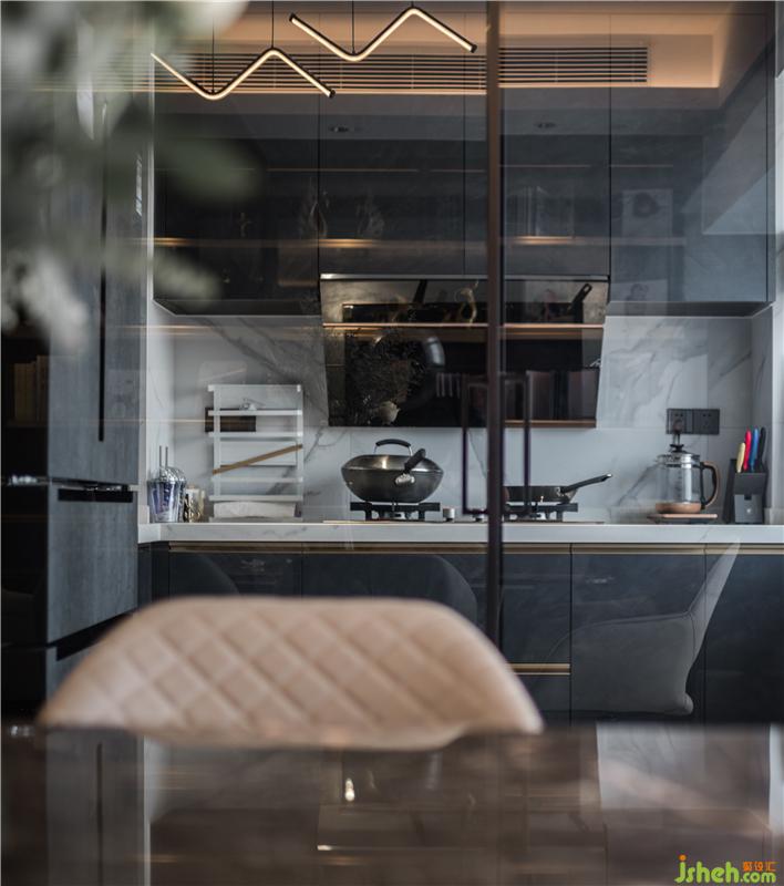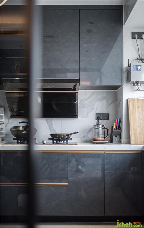 儲(chǔ)物室外墻面護(hù)墻板、展示柜、廚房外墻面用統(tǒng)一材質(zhì),讓空間立面體塊關(guān)系融合更統(tǒng)一,視覺感更舒適。