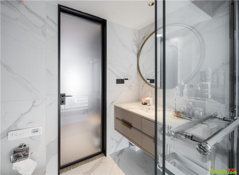 將衛(wèi)生間一分為二,干濕分區(qū)。所以使用半隔斷玻璃阻隔,讓動(dòng)線更為順暢的基礎(chǔ)上,視野更加通透,光線充足。