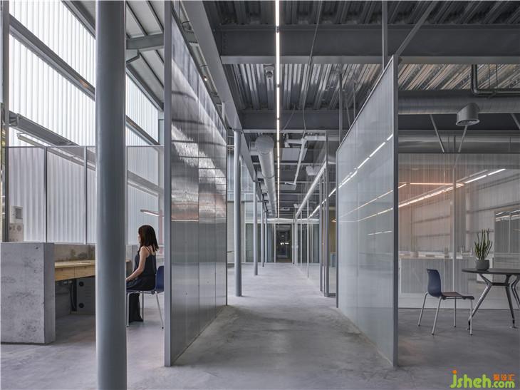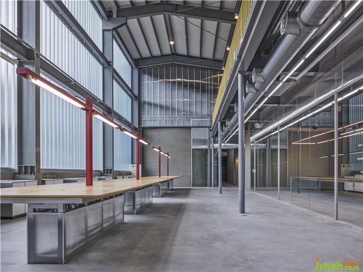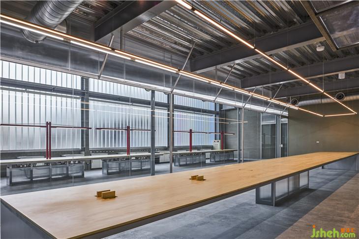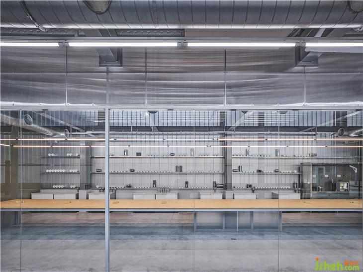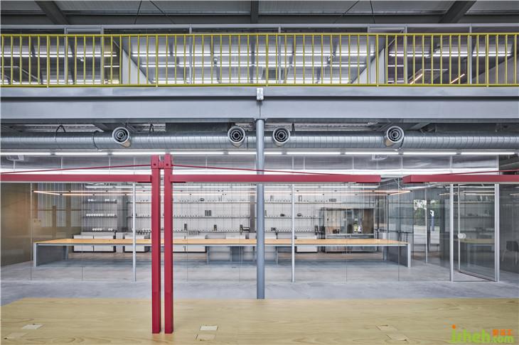 ▲訂制紅色燈具在一片機械色彩中,成為亮眼新穎的設計線條。
