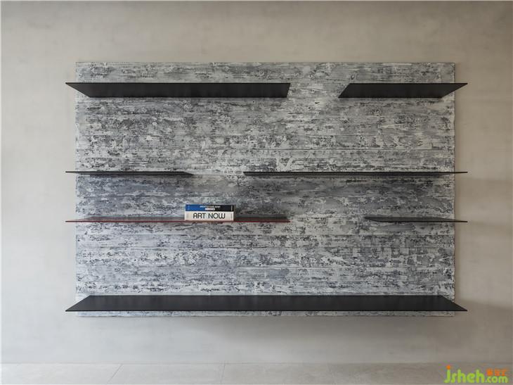 燒杉染白后的煙灰色裂紋,創(chuàng)造細(xì)致而自然的裝飾性線條。層架中一抹暗紅若隱若現(xiàn),整座層架宛如一幅極簡主義浮雕畫作。