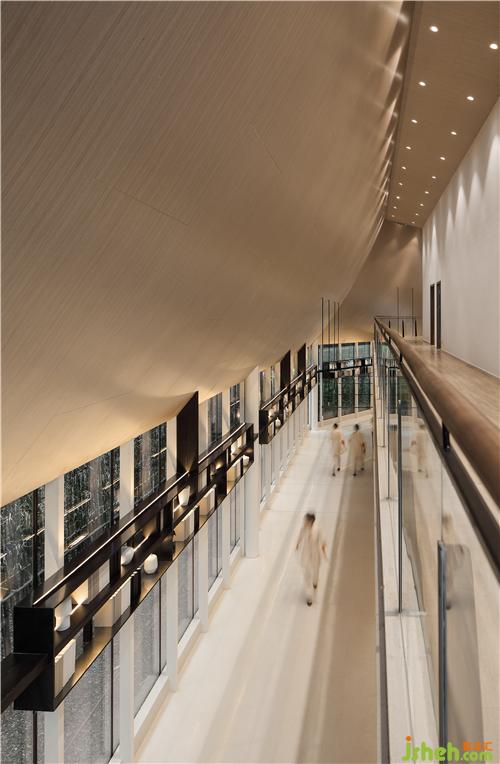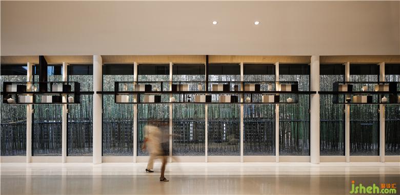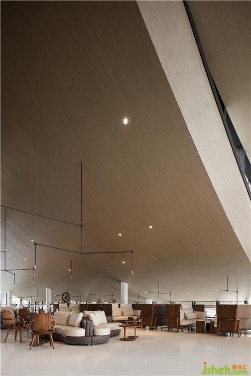 Black and gray steel bars form the spine of the rooftop, stretching and undulating like rolling mountains. Combined with the wide pool on the ground, a visual image of landscape painting is in sight. Transparent glass curtain wall interacts with reflections of clouds and lights in the water, creating a fascinating view and bringing spiritual peace of “A breeze produces no ripples”.售樓處設(shè)計(jì)