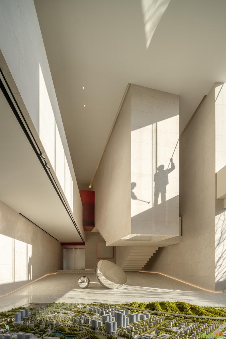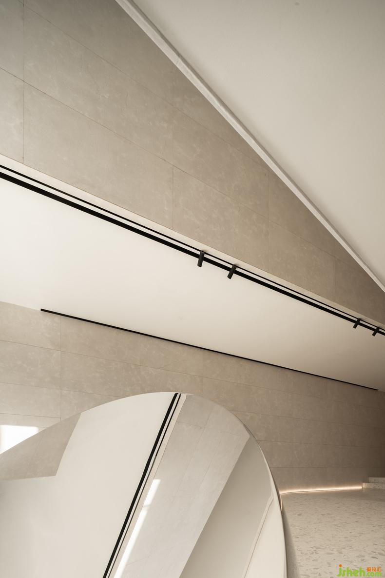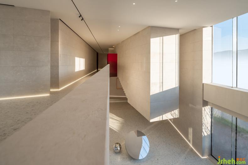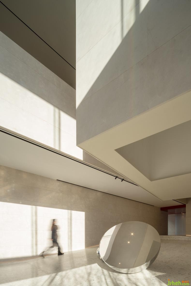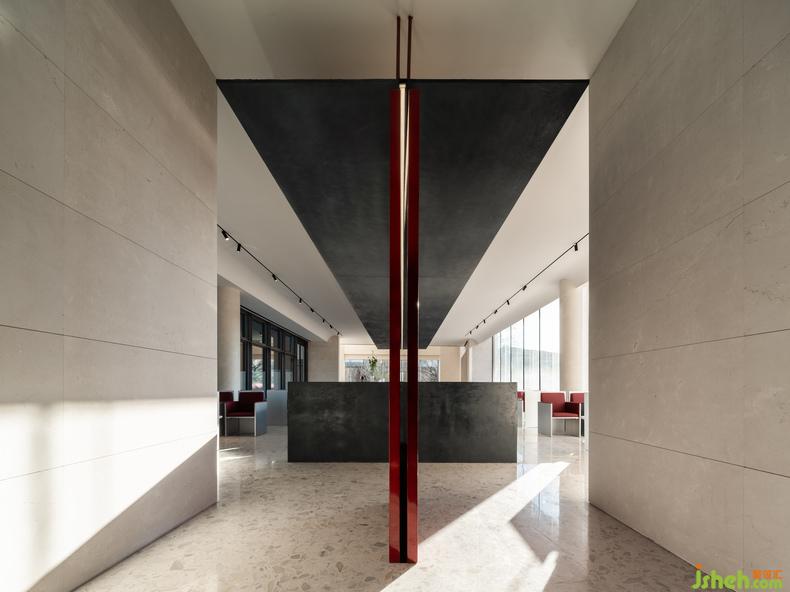 大幅藍色安定了西側咖啡廳,吧臺或底墻,寧靜如靜夜海中黝暗的島嶼,安撫躁動,藝術中心設計使人放心將自己安置其中。飽滿的紅,乍然現(xiàn)身又爽脆地收邊,例如中庭末端延伸向后的飛檐、色域之間的甬道,是路徑上落下的面包屑、畫中的楔子,毋需文字便能引導動線,使人順應直覺探索未知,恰如創(chuàng)作者下筆時不假思索的意念。