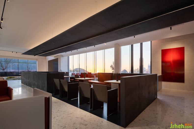 跨越量體的樓梯結(jié)構(gòu),以石灰白和雕塑般切割線展示藝術(shù)質(zhì)地,濃厚的白緩緩相接交疊,模糊筆觸秩序而顯得寫意。藝術(shù)中心設(shè)計(jì)天井下抽空時(shí)間感的白、量體間銜著影子的白,各具性格、超越理性計(jì)算,它們在畫中遼闊無聲,令情緒得以喘息。二樓藝文學(xué)堂則以暖白填滿角隅靜謐,在穿越撼動(dòng)各樣情緒的色域、離開畫作之前,以一段中性空間沉淀統(tǒng)合飽滿的感受。
