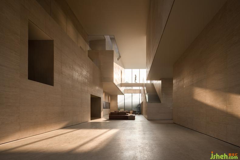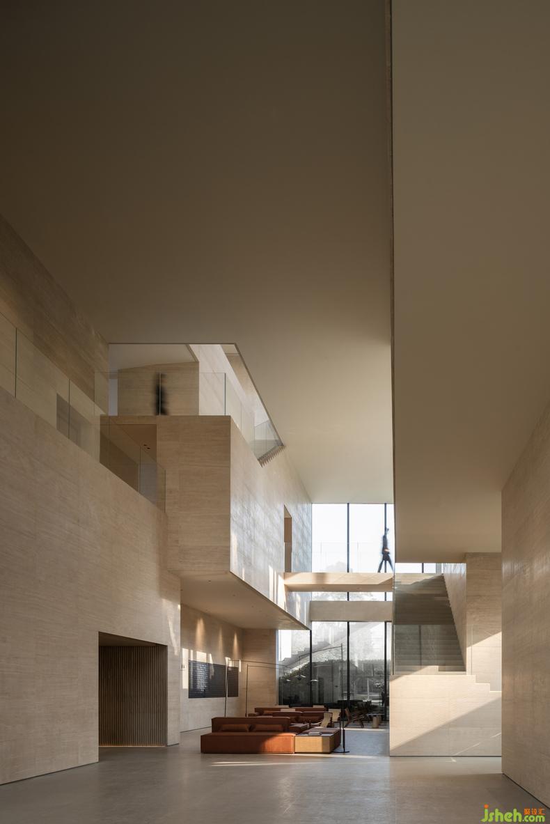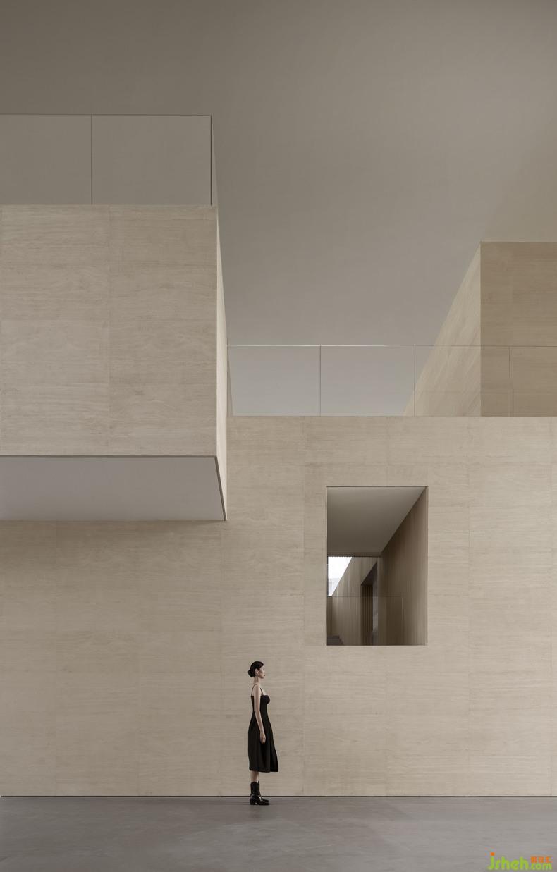 為強化量體搭接、挑空挑戰(zhàn)視覺穩(wěn)定感,選擇質厚的洞石,表面經(jīng)特殊處理保留孔隙及邊緣不盡筆直的切割線,恰如時間對建筑的消磨與積累,是工業(yè)器械難以仿造、處在過往與未來之間的未竟之美。