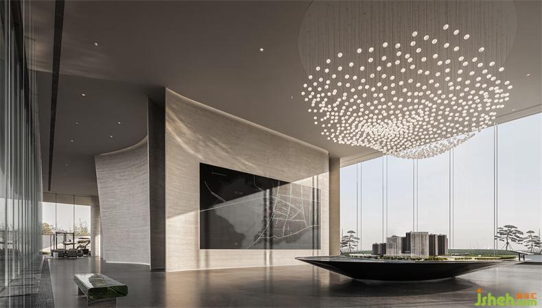 交疊垂直立面兩側(cè)留有臨窗路徑,售樓處設(shè)計(jì)逐漸現(xiàn)身的座位如航行時(shí)望見岸上星火點(diǎn)點(diǎn),旅程中目的地逐漸浮現(xiàn),漸強(qiáng)和聲引起人們對(duì)后方樂章的憧憬。