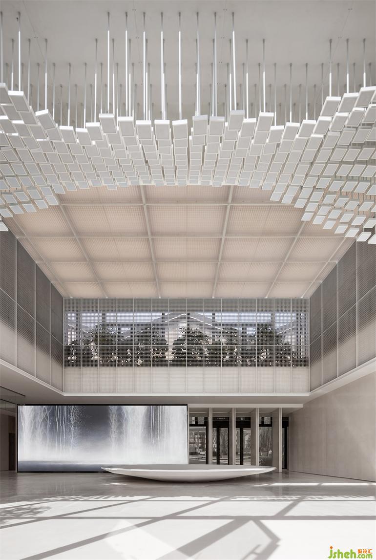 想像踏入建筑即陷入一處多格放映的劇場,相較于喬木真實(shí)在旁的室內(nèi)叢林,售樓處設(shè)計(jì)格柵及噴砂壓克力屏蔽的枝葉,因切割而輪廓離散如二維圖像,經(jīng)由一格格數(shù)碼編排序出幻境,引人好奇:網(wǎng)格內(nèi)的枝葉將以自然抑或數(shù)碼形式生長演化?