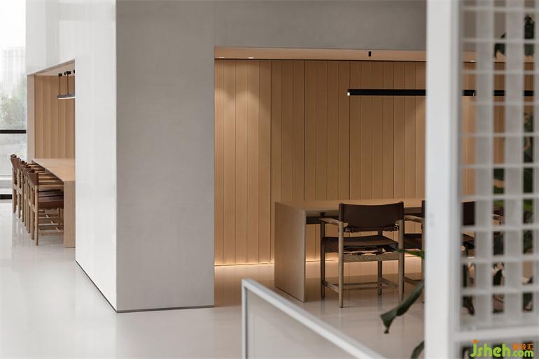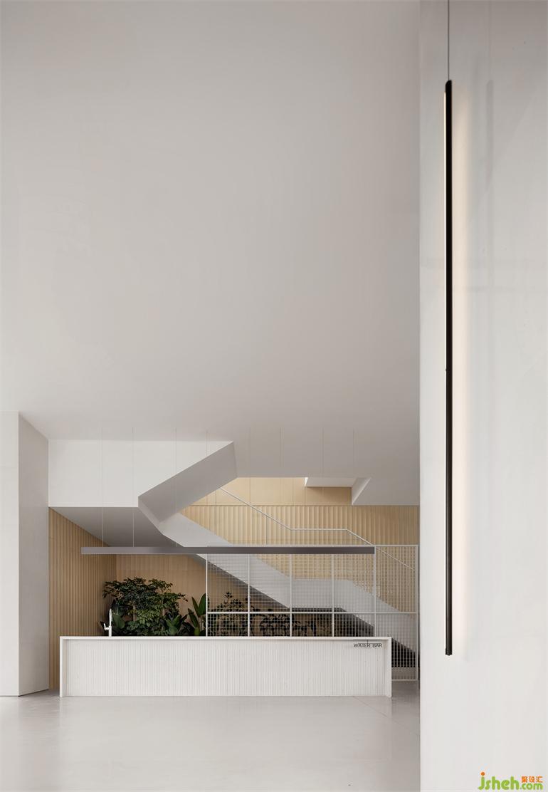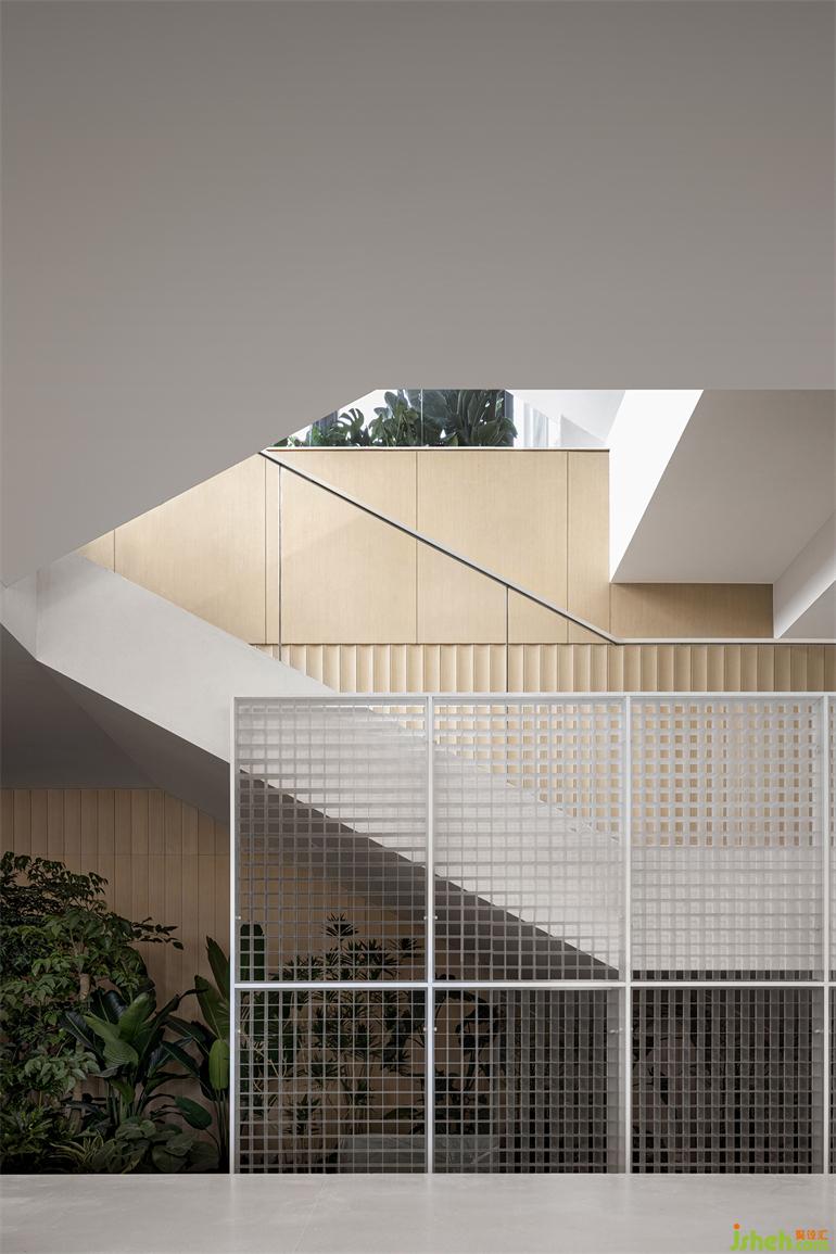 長時間的靜態(tài)活動藏于量體內(nèi)部,釋放開闊場域給串接、流動的短暫行為,有別于格柵產(chǎn)生的網(wǎng)格影像,橋梁上的片刻動態(tài)是更銳利、穿透的,如此一幕幕層疊出景深。無論身處哪一事件場景,目光總會停在中央似長幅屏幕的格柵,售樓處設計節(jié)錄一幕又一幕生活的段落,遺忘了起頭、尋不著結尾。