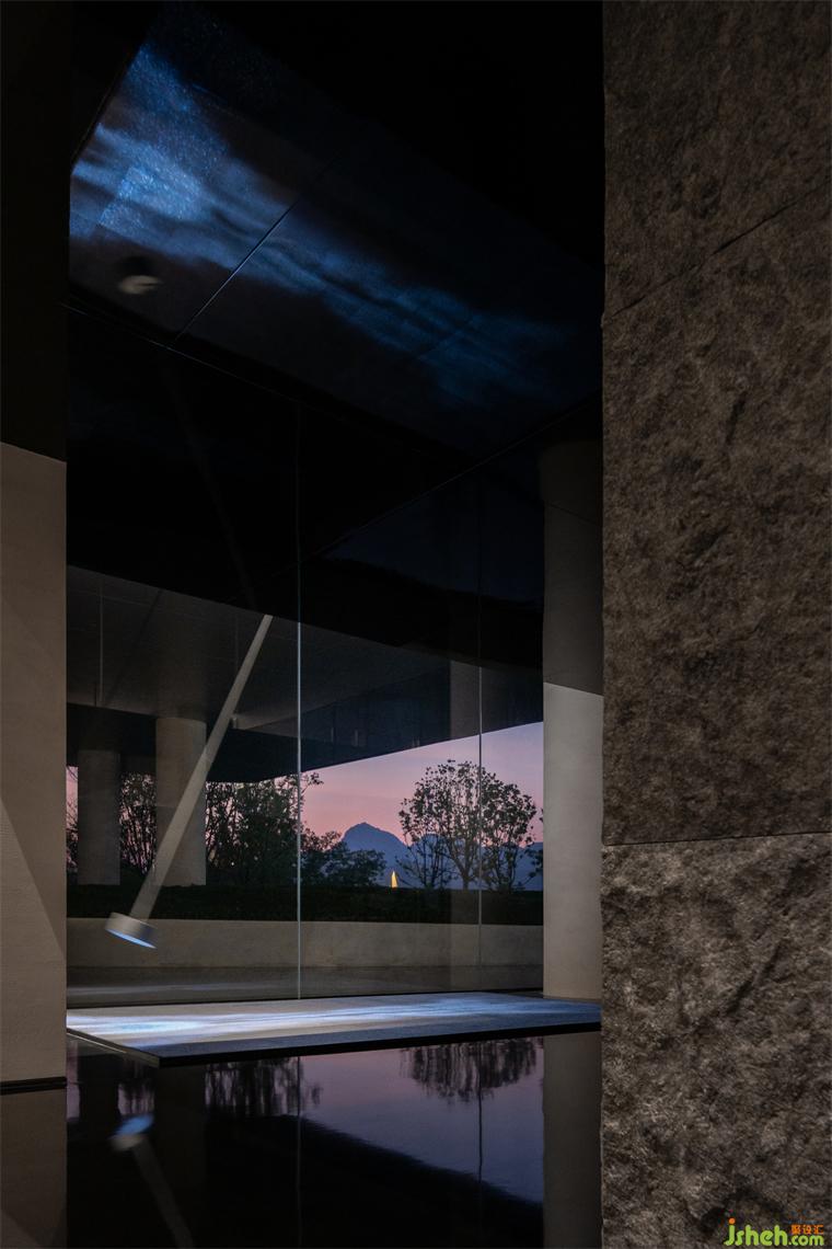 山前一泓深邃平靜的氤氳江岸,裝修設(shè)計映照峰林起伏與偶爾掠過鳥飛人影。設(shè)計師想像穿梭建筑內(nèi)部如登山的修習(xí),穿過枝葉相掩、巨石遮天的隧道或于崖下仰眺山峰高聳,感受個人心境轉(zhuǎn)折及不執(zhí)著物象的澹然。