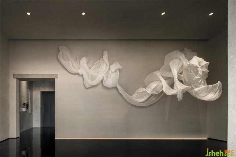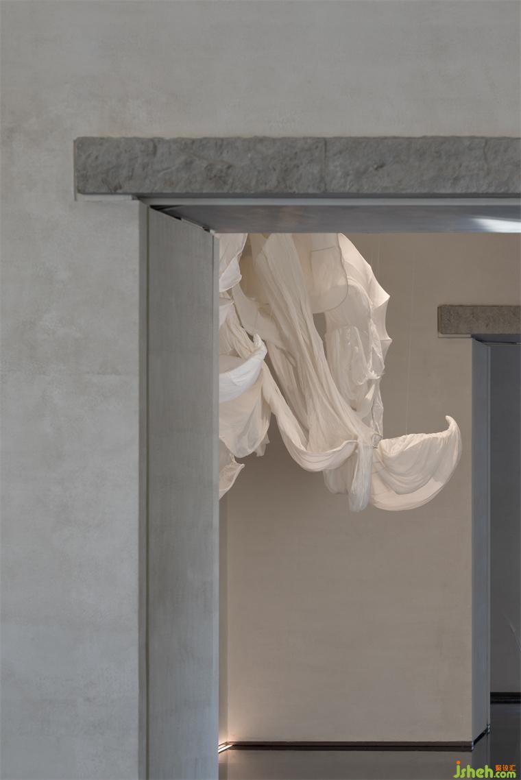 白色織品于壁面飛騰的凝結(jié),裝修設(shè)計像狂草連綿的放縱,亦如漁民在清晨江心拋灑漁網(wǎng)一瞬,人世間所有變動與燦爛,終將在山水間歸于靜定無波。用絲線懸垂勾勒出縹緲自然的紡織裝置形態(tài),彰顯一種即興的、無意識的表達狀態(tài),又恰似水墨入紙的一瞬間,空靈灑脫。