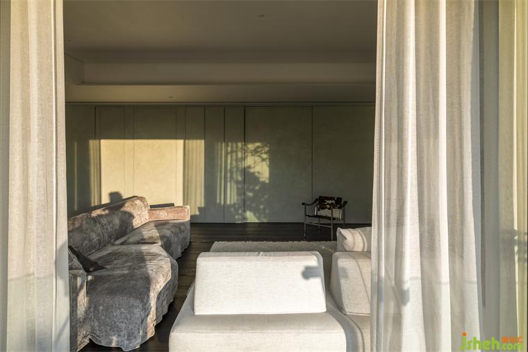 入口一路延伸至主臥的長軸線空間,住宅設(shè)計正對窗景的主墻如一卷沉靜畫布,我們挑選光澤如玉的「秘色」作主調(diào)。來自晚唐時期越窯出產(chǎn)的「秘色瓷」,愛茶詩人徐夤曾以「月染春水」、「薄冰盛綠云」詩句描述,其色類玉類冰介于白灰、碧綠之間。非直白模擬戶外綠意,而是綜觀真實(shí)環(huán)境、光線與個人感受揉出詩意色調(diào),退入霧中的含蓄,軟而綿長舒展成起居背景,只見樹影因風(fēng)搖曳。