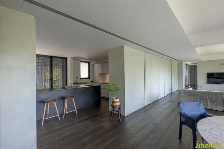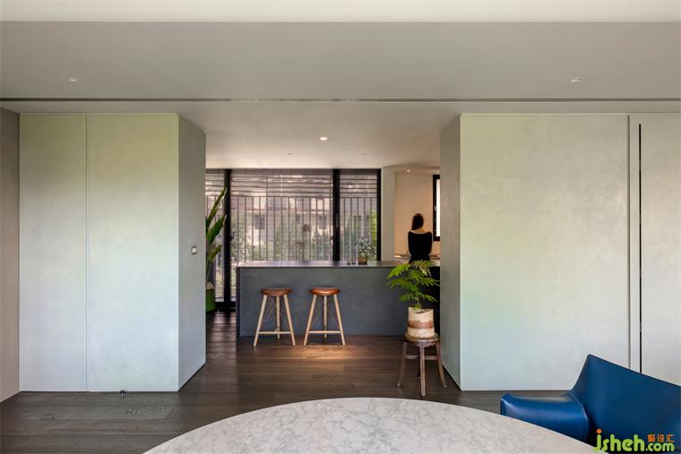 而漆料礦物粒子折射日光的強(qiáng)弱變化,住宅設(shè)計使早晨清麗如未散的薄霧,翠色漫著一層灰白;當(dāng)夕陽直射入室,色溫使墻轉(zhuǎn)為帶著光澤的碧綠;入夜開啟照明時,白中帶綠的層次似暖玉,隨視角變換色階,如山色在有與沒有之間最美。