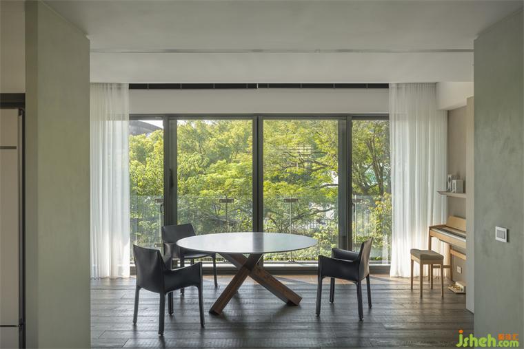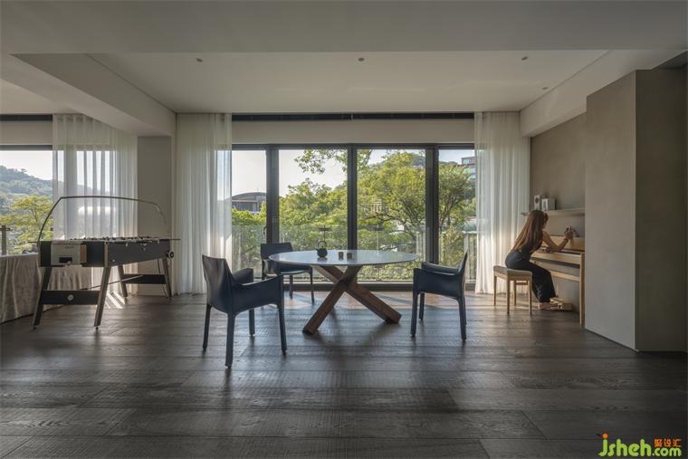 本案長型基地一側(cè)擁有連貫窗景和帶狀露臺,住宅設(shè)計熟悉山林的屋主遷至市郊生活仍擇鄰近故宮、一處有山有溪的住所,希望自然曾經(jīng)帶給他們的情懷能在此繼續(xù)生長。我們將起居環(huán)境視為呼應(yīng)戶外溪林的文本,企圖在故宮藏品間找到表現(xiàn)空間的調(diào)子。