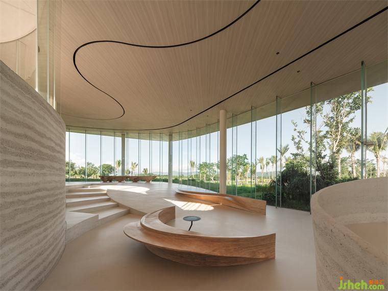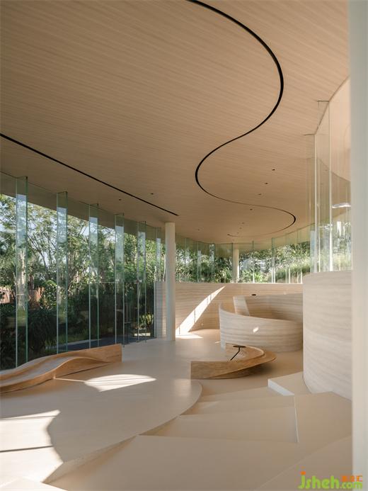 如此模糊水平基準面的做法,加上窗外地景延伸的景深,生態(tài)公園設計使空間呈現(xiàn)一種漂浮、無序的流動狀態(tài),呼應河水奔流的動感。