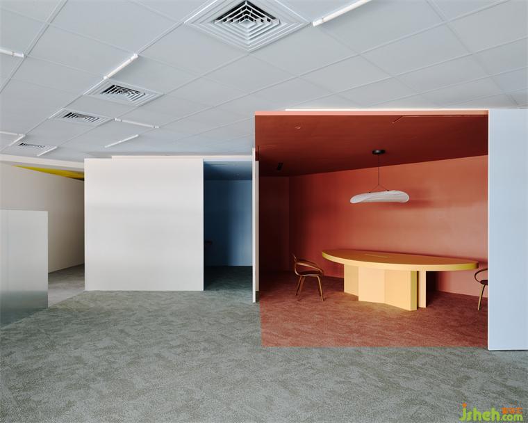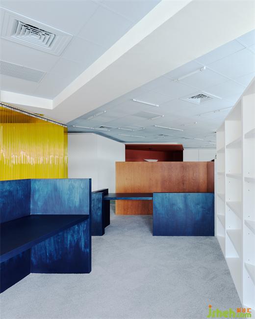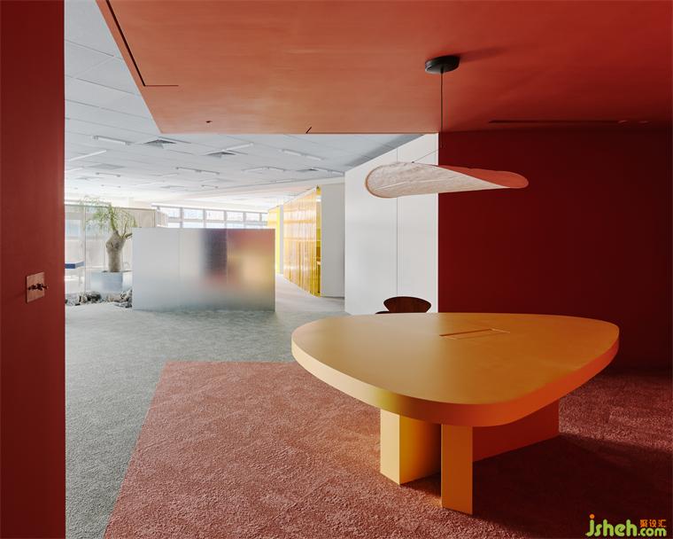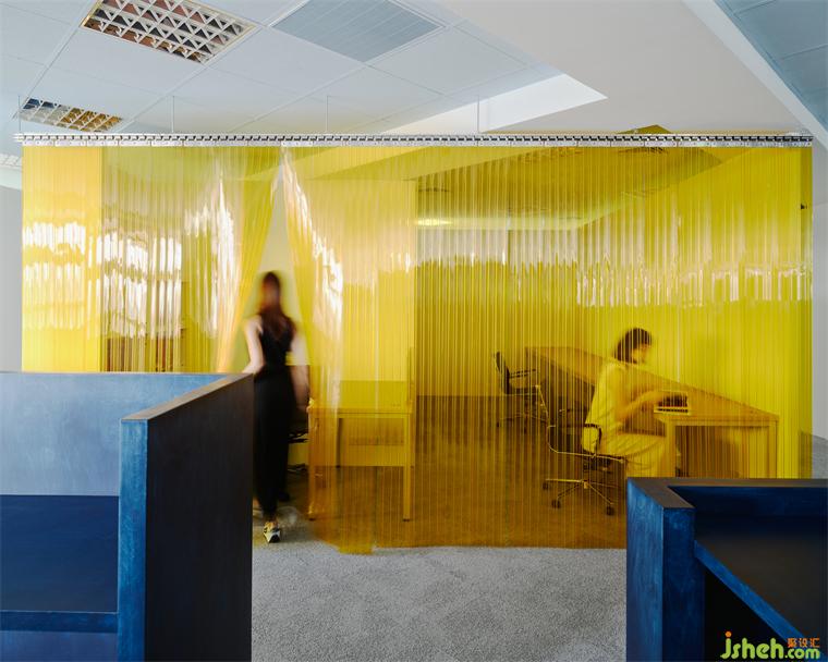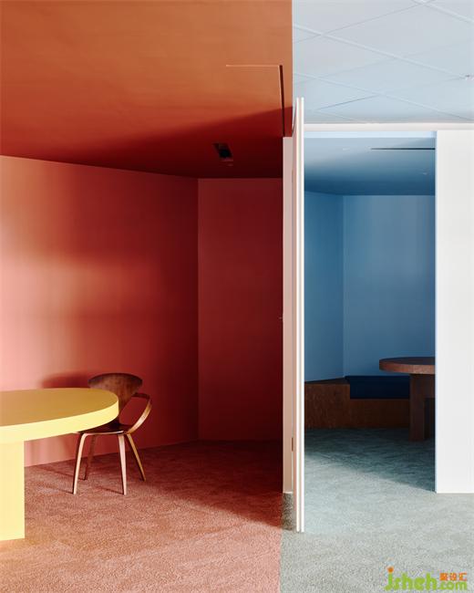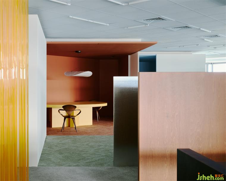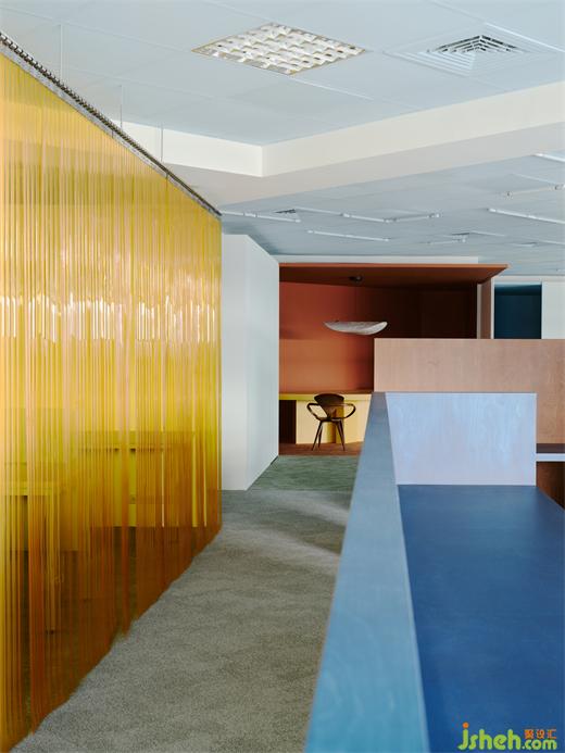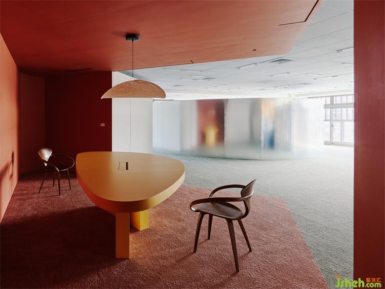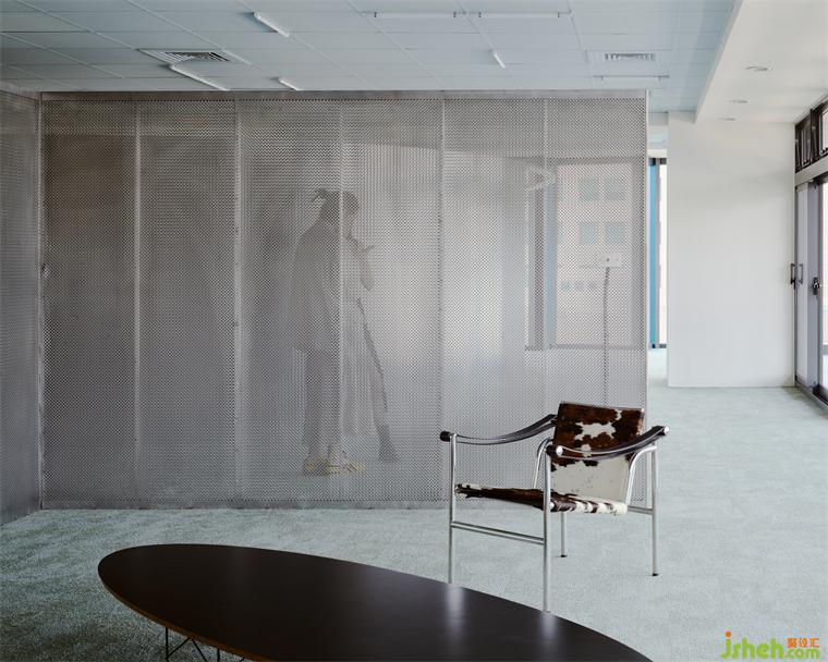 為了在有效的成本控制中做出質(zhì)感,設(shè)計師也利用大量的原始材料,例如夾板染色取代貼木皮、鍍鋅板直接做隔間墻、地板選用色塊地毯,因為這些都是趨近于本質(zhì)的材料,毋需額外貼附材質(zhì)修飾,辦公室設(shè)計包括原辦公室的輕鋼架也僅用色彩改變原先質(zhì)地。