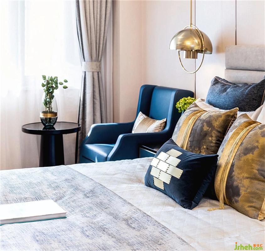 藍(lán)色元素的點(diǎn)綴與燈光的糅合,棉麻與絲綢相呼應(yīng)。
