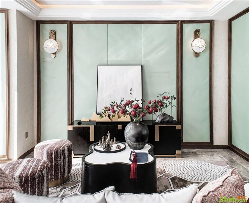 新中式做為整體的風格走向,空間點綴幾片淺綠色,餐廳背景墻裝飾花,娓娓道來東方獨有的氣韻??臻g的線條以方方正正居多。采光,落地窗與吊頂暗藏燈帶的完美結合,純粹的白作為空間主色出現,佐以中式家具,烘托出一種文雅與風度,淡雅而靜謐。