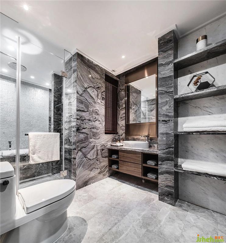 The bathroom space is very large, the wall is covered with black and white gray variegated tiles, the shower room is set with dry and wet partitions, and the dim light is used to reflect the low-key beauty of the new Chinese style.