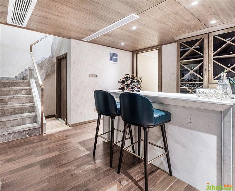 The design of the wine cabinet emphasizes practicality and decoration. The combination of solid wood ceilings, wooden floors and wine cabinets, the jazz white marble bar is soft and clean, and the introductory design creates a noble living space.
