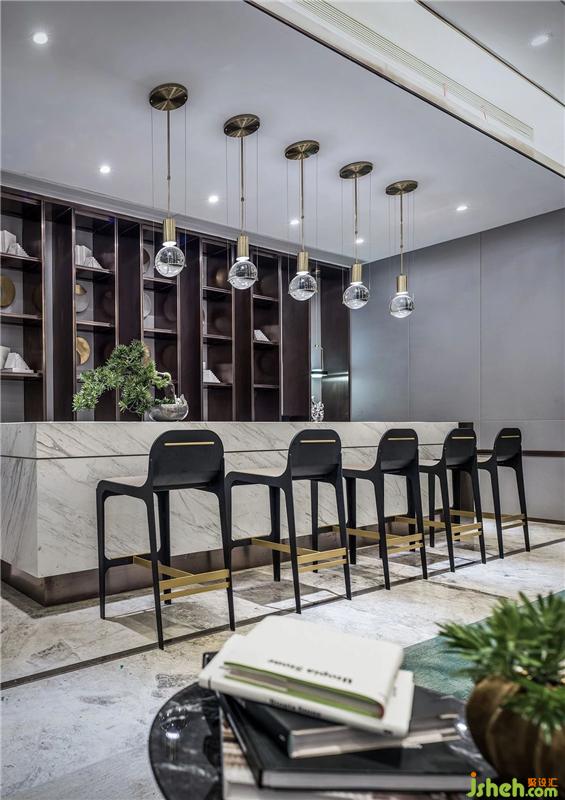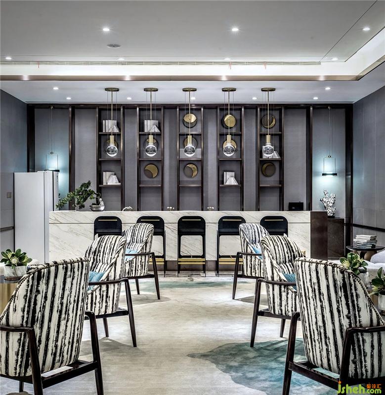 ▲水吧臺(tái)處“月球”造型燈飾與墻壁形狀不一的金屬?gòu)澰略煨拖嗪魬?yīng),強(qiáng)化空間的設(shè)計(jì)主題,寓意深遠(yuǎn)。以“客”為尊,以“恭”為佳,創(chuàng)造出靜與美的意境......