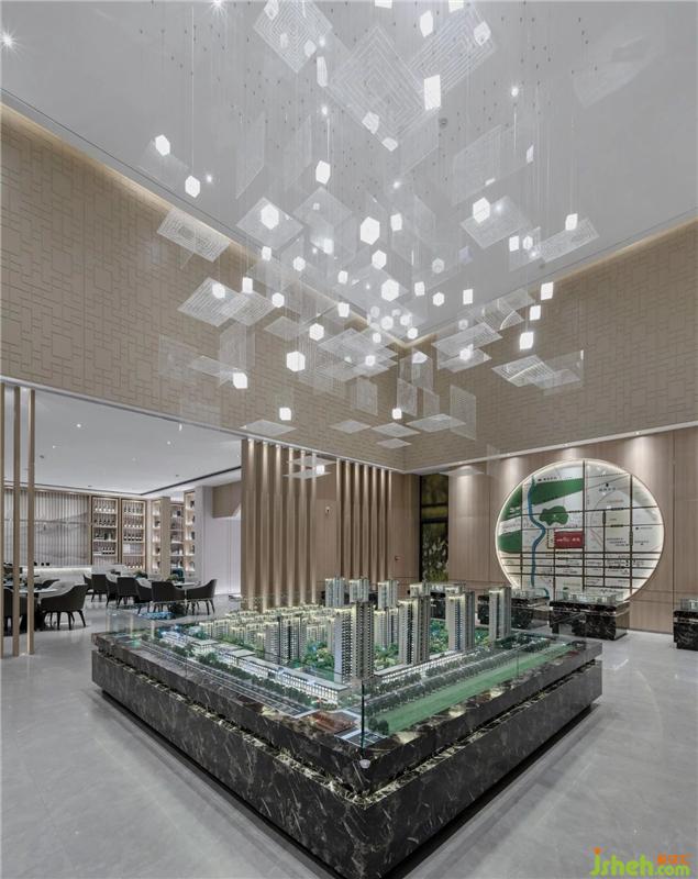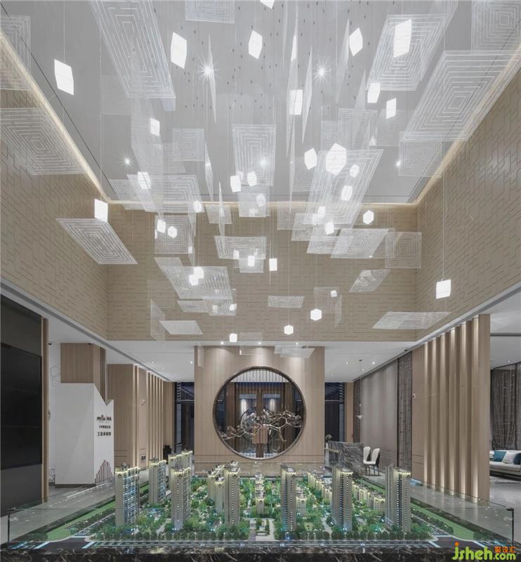 沙盤區(qū)一組大型白色藝術(shù)裝置吊燈映入眼簾,亞克力片裝置形成虛實(shí)相間的韻律感,喚醒空間的靈魂,尤其在墻壁棕色木質(zhì)材料的襯托下顯得格外明朗有力,形成強(qiáng)烈的反差與對比。無論從光影,顏色還是材質(zhì),都在著力營造一種空間的延伸,既相互依托又各有千秋。會(huì)所設(shè)計(jì)