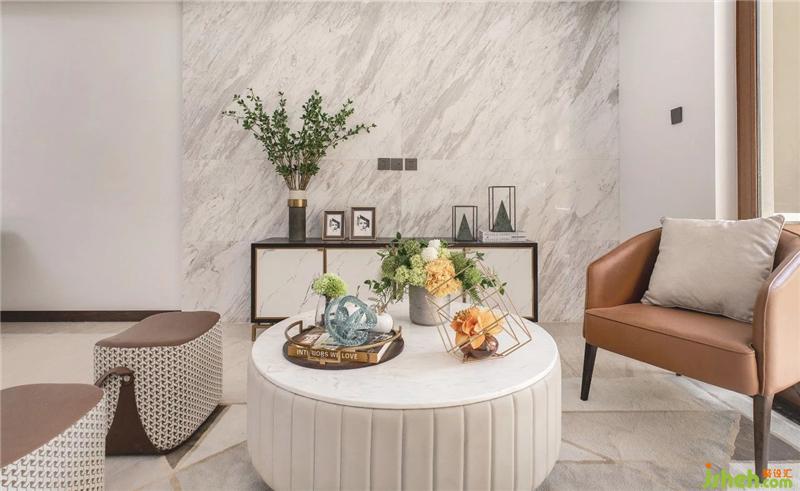The space is properly white, the walls are covered with gray and white marble, clean and neat ornaments, and equipped with modern fabric sofas, the lines of the space are simple and smooth. The contrast between orange and white, the furnishings are just right. The living room gives people a refreshing feeling, even if it is a hot summer day, it is not easy to feel irritated!