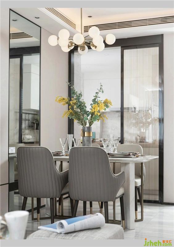 The green space extends to the restaurant. The simple marble dining table, suede wooden metal chair, stylish and rustic chandelier design, embellished with a touch of yellow and green, is very harmonious, showing the owner's peaceful attitude and life taste.