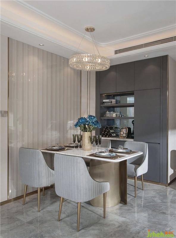 餐桌花藝以及餐具點(diǎn)綴寶石藍(lán),與主題相呼應(yīng)。以豐饒的創(chuàng)意表達(dá)生活內(nèi)涵和當(dāng)代氣質(zhì),將空間具化為實(shí)用與美學(xué)交織相融的生命體,賦予空間輕奢、雅致而舒適的生活氛圍。