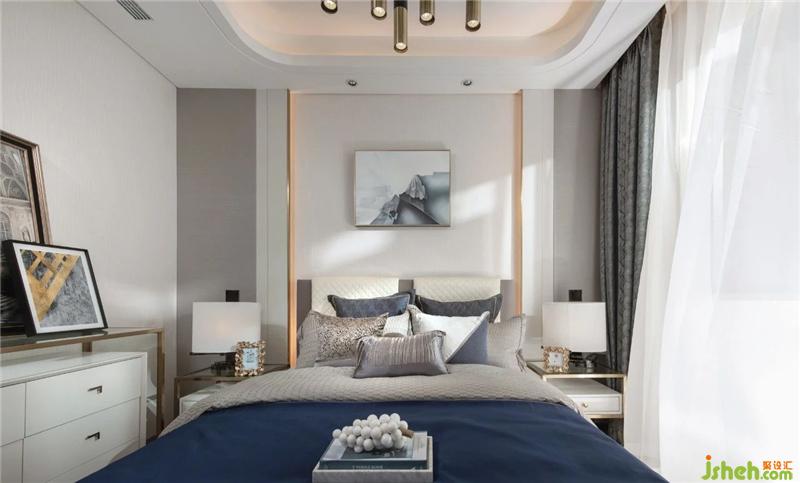 次臥空間繼續(xù)延伸藍(lán)色元素,與現(xiàn)代裝飾畫(huà)相得益彰、交相輝映外,白色的幾何線條、輕體量的功能性軟裝搭配,讓整體空間不失層次感。