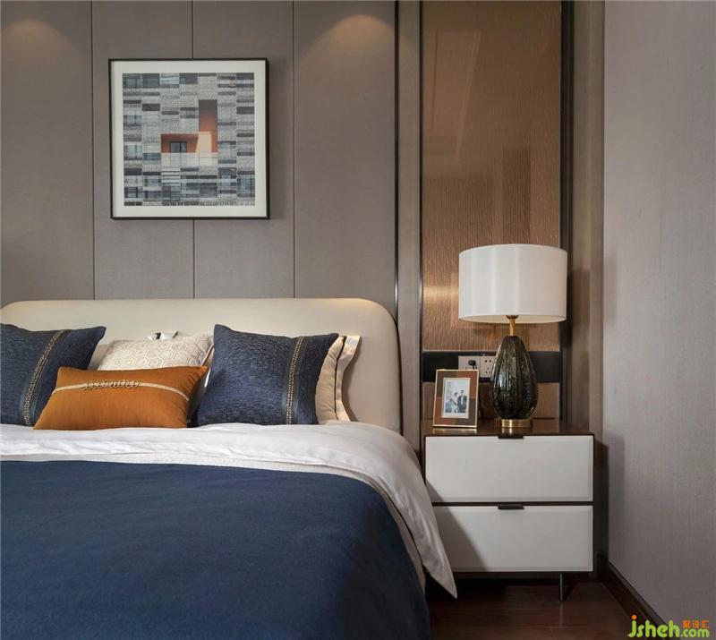次臥的冷色床品與墻面、掛畫相搭配,乳白色柜體有了棕色的裝飾條,光源的暖色也不會顯得突兀。