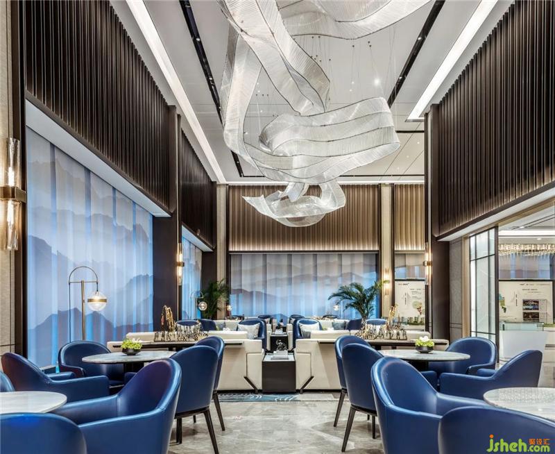 藝術(shù)裝置吊燈橫跨整個洽談區(qū)上空,賦予了靜止的空間鮮活的生命動力,以流線的動感,強化設(shè)計主題。自然生態(tài)與科技感,藝術(shù)性與文化氣氛相交織,不失現(xiàn)代與時尚感。售樓處設(shè)計