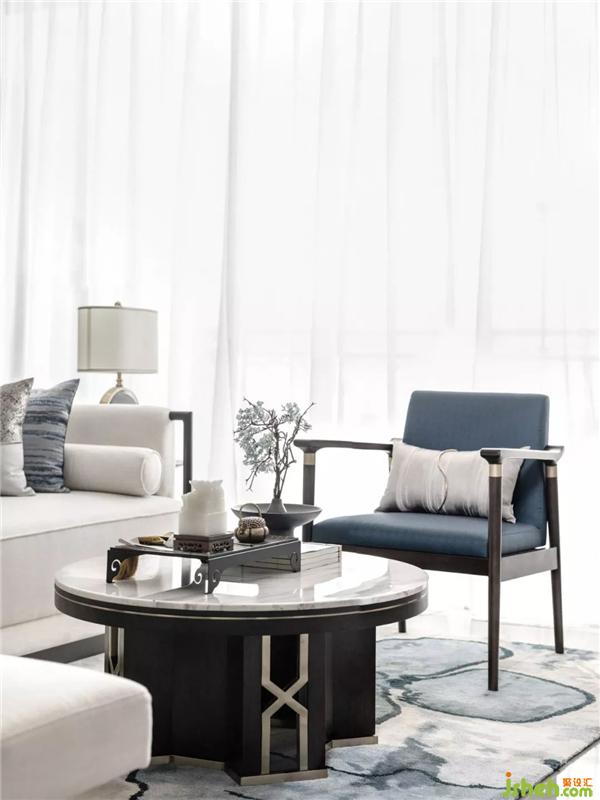 項目材質(zhì)上選用溫潤的石材、精致的布藝、金屬、水晶等;色彩上則運用清幽淡雅的基調(diào),點綴沉靜的灰藍(lán)調(diào),搭配大地色讓整個空間干凈簡單卻不平淡。樣板房設(shè)計