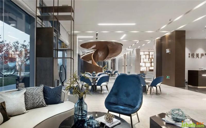 VIP room is a private space for in-depth conversation among key customers, prospective customers and contracted customers. According to different functional requirements, different furniture combinations are provided to meet the needs of a group of MINOTTI leather sofas, single chairs and square stools that the extended family came to discuss. The tea tables with metal and stone materials collide with each other to enhance the elegance and luxury of the space with blue and gold ornaments.