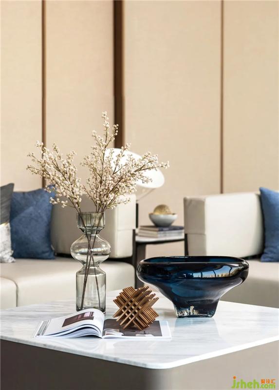 VIP室是針對重點客戶、意向客戶、簽約客戶進行深入交談的私密空間。針對不同功能需求,配置了不同的家具搭配,能滿足大家庭前來洽談的一組MINOTTI皮質沙發(fā)、單椅、方凳,搭配金屬與石材的茶幾進行材質的碰撞,點綴藍色與金色拼接的掛飾提升空間的雅奢感。裝修設計