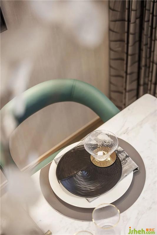 客廳作為空間交互的中心,大片落地窗與開闊的陽臺(tái),讓光線被最大化地保留。撲面而來的綠奠定了空間的清涼感,金屬元素以不同形態(tài)點(diǎn)綴在家具、燈飾的細(xì)節(jié)上,空間顯得更加清透、明澈。當(dāng)代都市人追求的綠洲情調(diào)隨著顏色和材質(zhì)的暈染,意境全開。