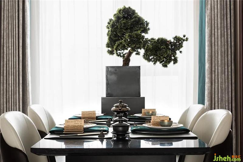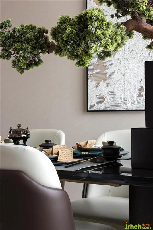 餐廳將東方質(zhì)樸的經(jīng)典古韻味還原,山與松、綠與白、金屬與質(zhì)感,整個畫面疏密有致,保留了通透大氣的空間感,將“用餐”深化到一個新的高度。新中式之所以大受歡迎,大概就是因為它在傳承經(jīng)典的基礎(chǔ)上,又用現(xiàn)代手法進(jìn)行了融合與創(chuàng)新。