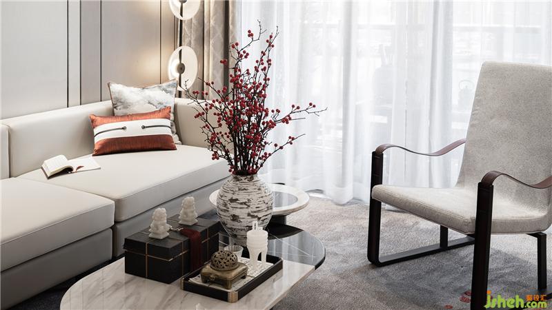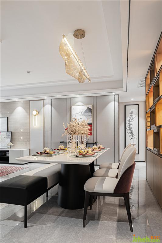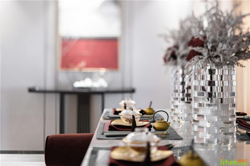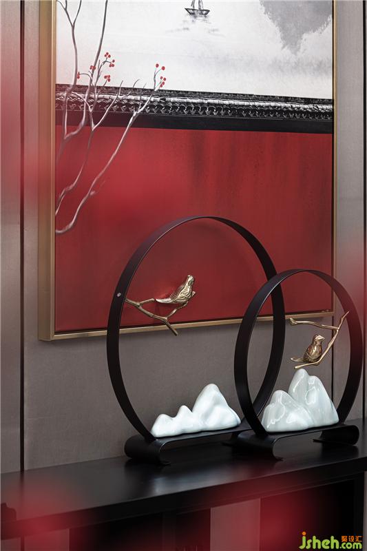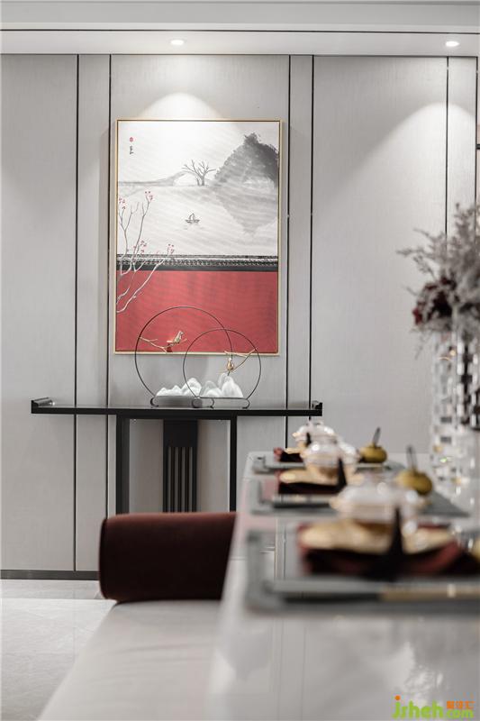 餐具、飾品結(jié)合整體風(fēng)格及空間氛圍,在自然光線與室內(nèi)燈光的點(diǎn)綴之下,更突顯品質(zhì)感,新中式格調(diào)的味道彌散在每一處細(xì)節(jié)。胡桃木與磚紅色搭配的端景臺(tái)點(diǎn)綴在入門盡頭,精美的畫作、氣韻生動(dòng)的倒流香擺件,整個(gè)空間更突顯悠韻綿長(zhǎng)之感。