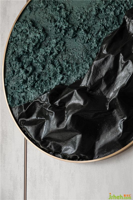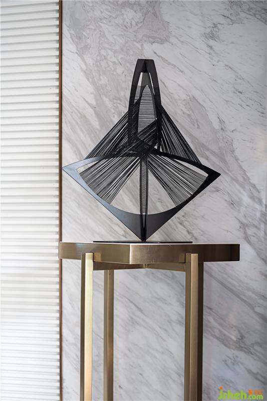 掛畫均采用新型復(fù)合材質(zhì)進(jìn)行制作,不僅僅是美觀,更像是新時(shí)代的一種標(biāo)志,就如同中山這座城市:急速發(fā)展,欣欣向榮。由于男主人設(shè)定為建筑設(shè)計(jì)師,雕塑我們選用了 Naum Gabo 的作品,它像一個(gè)解構(gòu)建筑,從側(cè)面體現(xiàn)了男主人的職業(yè)。Naum Gabo 是一位解構(gòu)主義雕塑家,采用“立體測量法”的手法建造不同的雕塑,這是他從建筑設(shè)計(jì)中引用的幾種技術(shù)之一,為解構(gòu)主義的發(fā)展做出了重要貢獻(xiàn)。