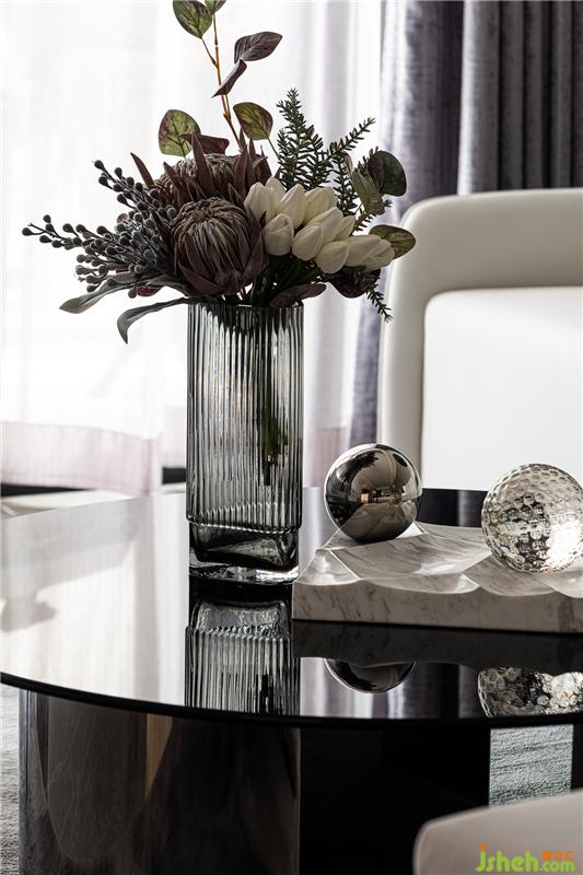7B戶型樣板房設(shè)計(jì)依舊以中性的黑白灰為主色調(diào),搭配點(diǎn)綴現(xiàn)代感十足的香檳金色,空間的顏色層次豐富又顯時(shí)尚優(yōu)雅。材質(zhì)以木材、金屬及優(yōu)質(zhì)的皮料、柔順的布藝構(gòu)成,從材料上把控整體軟裝的品質(zhì)。