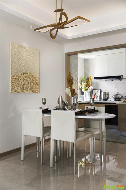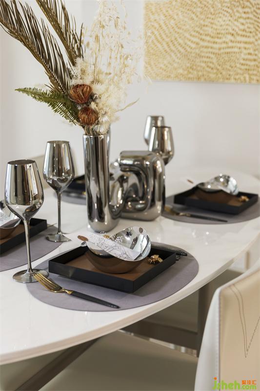 餐廳空間展現(xiàn)樸實不華之美,裝飾掛畫利落大方,裝飾花藝與餐具將家的溫馨感點亮,讓美好的用餐時光更添一份溫度感。