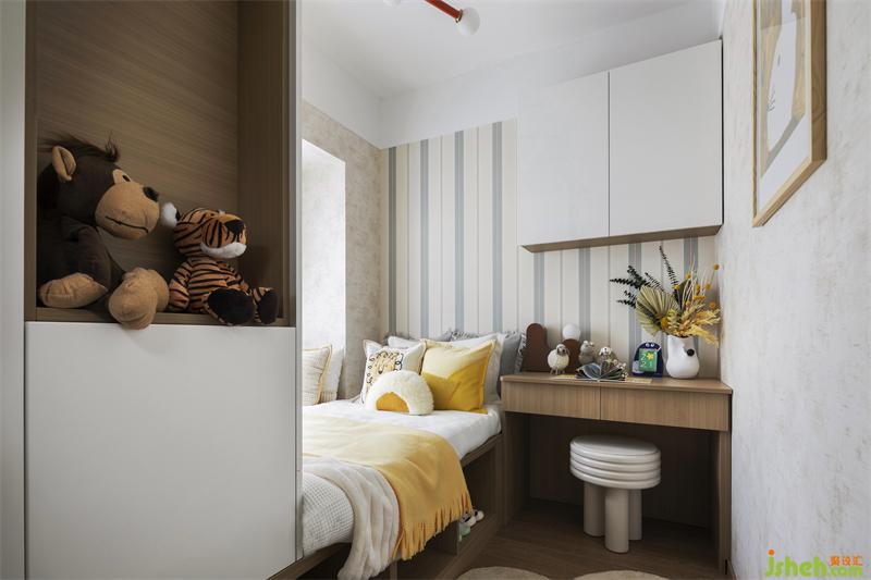 兒童房充滿童趣童真,契合整體空間的暖黃色床品和各式玩具,讓整個(gè)簡(jiǎn)約的風(fēng)格里加入了一絲俏皮,仿佛走進(jìn)了夢(mèng)幻的童話世界。