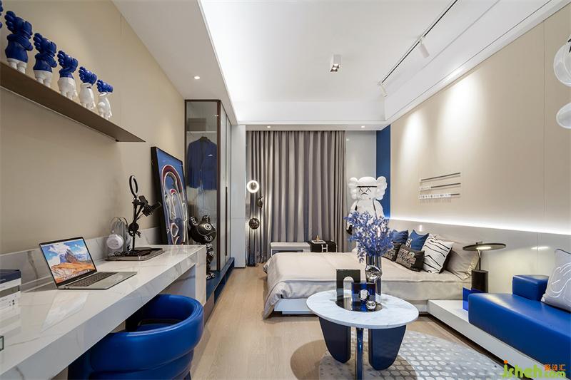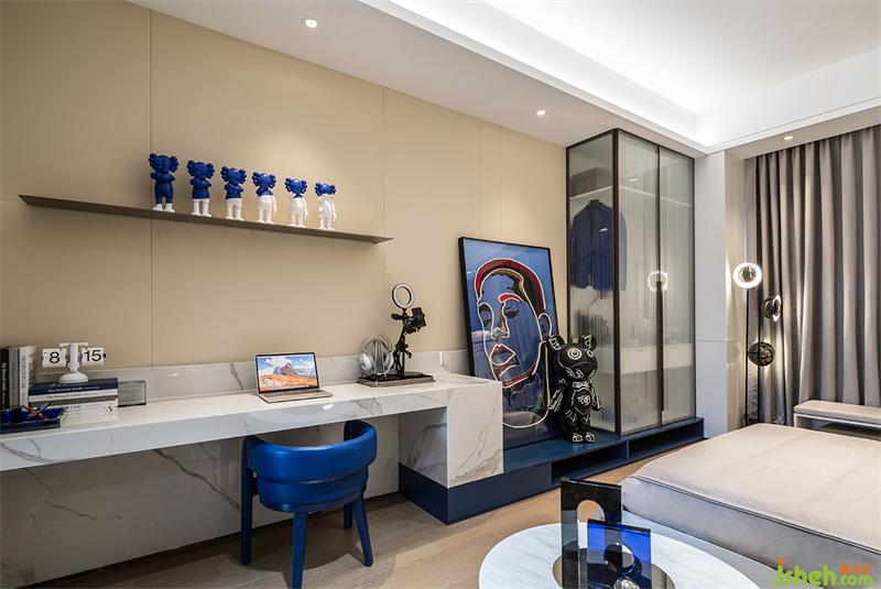 結(jié)合主人公的職業(yè)及愛好,我們將空間引入了極度純凈的克萊因藍??巳R因藍是一種獨特的天青石藍色,兼具群青色的深沉內(nèi)涵,和藍寶色的高貴光澤,能喚起人們最強烈的心靈感受。整個空間兼具時尚潮流和生活溫度的同時,又非常注重居室空間的布局與使用功能的完美結(jié)合。