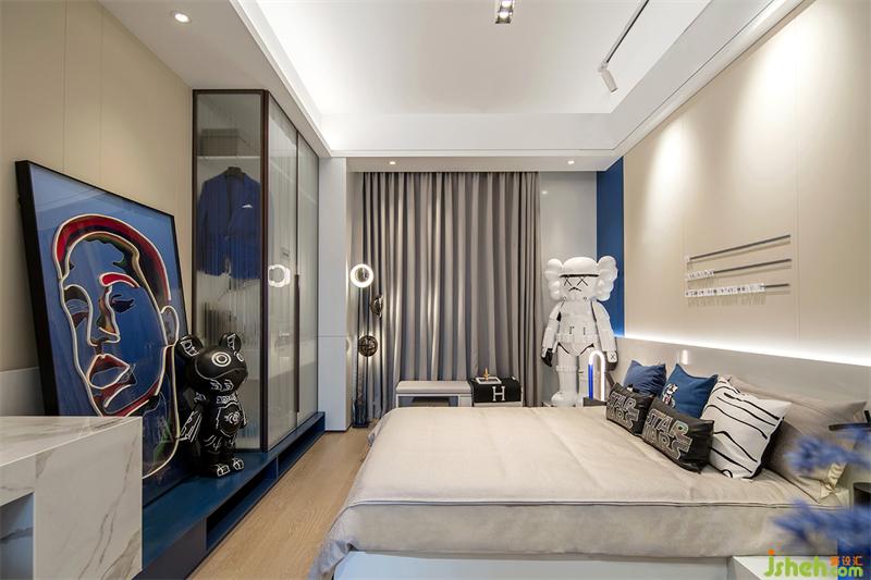 空間整體以灰白皮革硬包加墻布打底,在干凈利索的底色上鋪陳克萊因藍,通過不同大小不同體態(tài)的KAWS玩偶的陳設(shè),讓整個空間充滿了動感。
