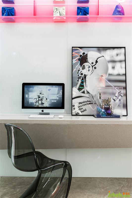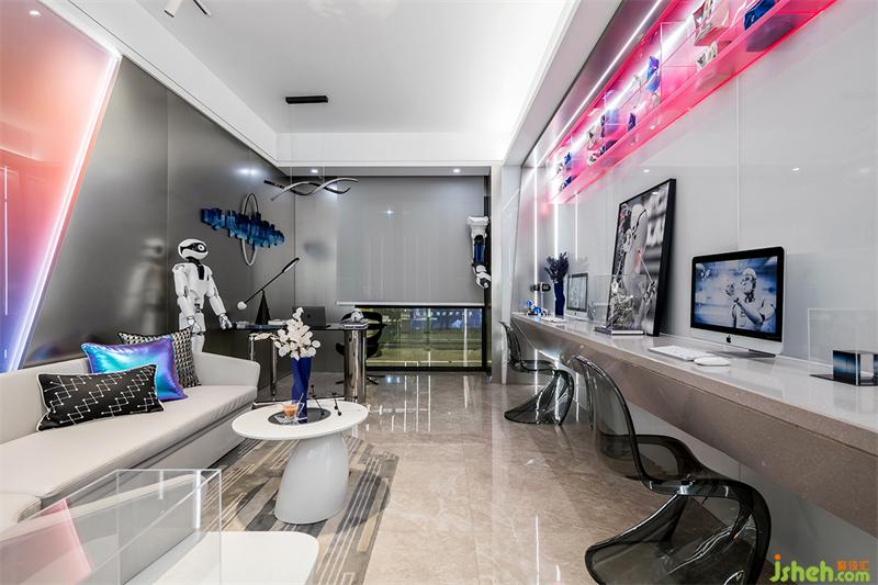 辦公區(qū)配以造型別致的桌椅,打破了空間的單調(diào),展示區(qū)墻面機(jī)器手臂掛飾以及大屏電腦配置為來訪者提供互動(dòng)體驗(yàn),感受科技的神秘力量,以此致敬科技的發(fā)展,表達(dá)對科技探索的渴望,引領(lǐng)著人們在舊范式與新空間,未來與現(xiàn)實(shí),虛與實(shí),動(dòng)與靜中來回穿梭,營造一個(gè)年輕,時(shí)尚,個(gè)性又充滿科技感的辦公空間。