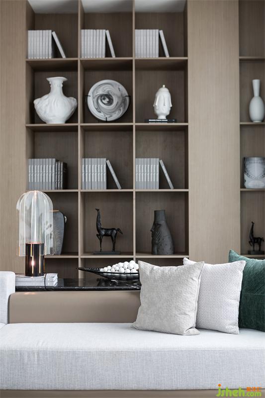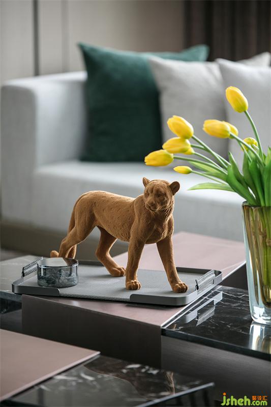 超大L型落地窗大客廳讓整個(gè)空間豪氣十足,盡情享受城市的天際線,24小時(shí)觀賞城市的發(fā)展與變遷。意大利MINATTI轉(zhuǎn)角組合沙發(fā)可以自由切換成會客聚會模式和家人閑坐燈火可親的合家歡模式。象征著與時(shí)間賽跑的“時(shí)光的腳印”掛飾,笑容可掬的獵豹模型,拍賣會收集的金屬象牙藝術(shù)品,剛剛?cè)计鸬墓虐脱┣?,冉冉升起火苗的嵌入式電子壁爐,整排存放藝術(shù)收藏品的展示柜,無不展示著主人的審美情趣和對藝術(shù)品投資的熱忱,腹有詩書氣自華的書卷氣與藝術(shù)合二為一。
